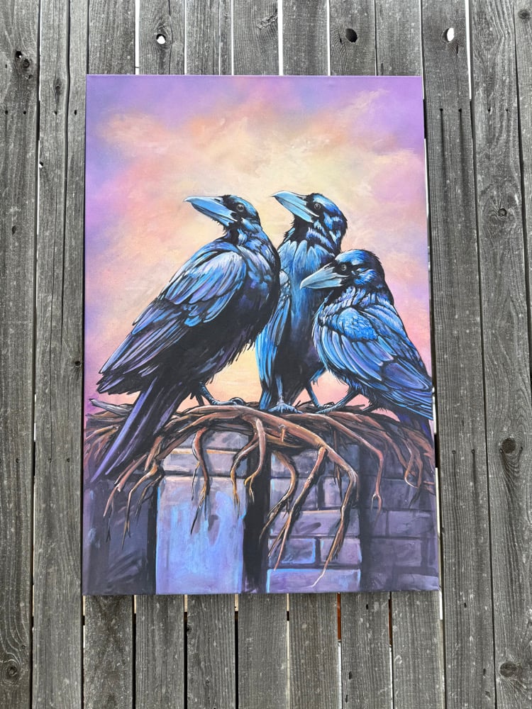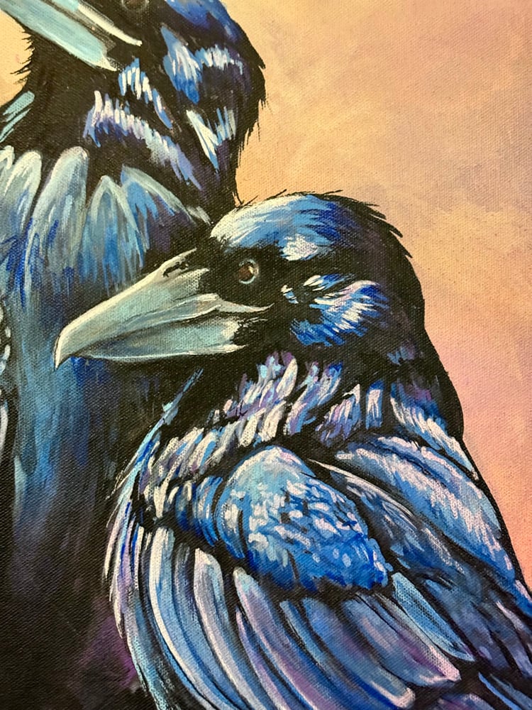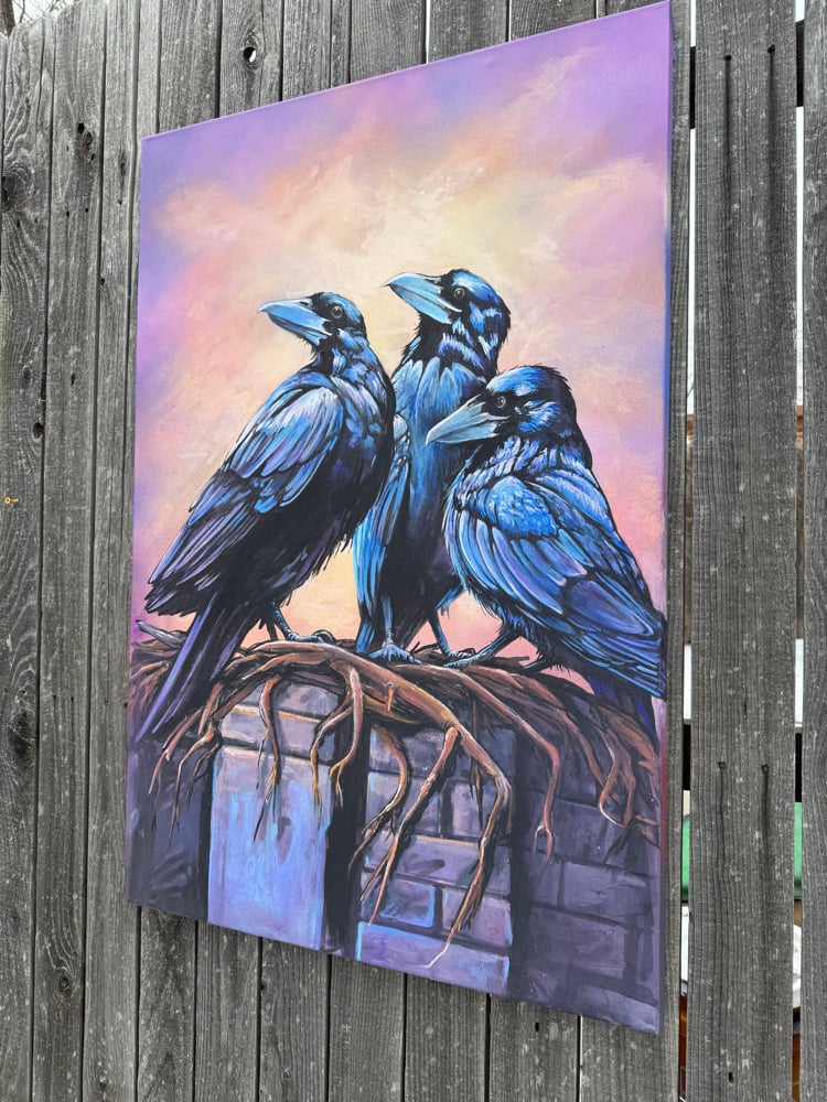 Pleased to show the third piece “Three” (varnished 24”x36” spray paint and acrylic on high quality canvas) of my newest series “Ravens” 🐦⬛ I have always been fascinated by ravens even from a young age I loved seeing them and have always taken them as a good omen. There are very few species that are as intelligent, work together so well, can recognize faces and mourn their dead.. among many other fascinating characteristics. Did my best to capture some of the magic that I see in them ✨